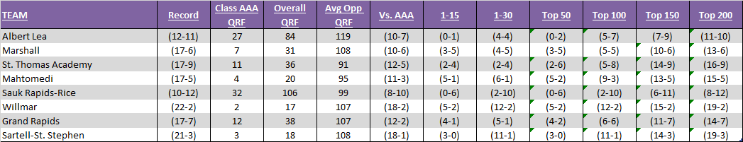- 1-30 = Record vs Class AA Opponents with Class QRF better than or equal to 30th